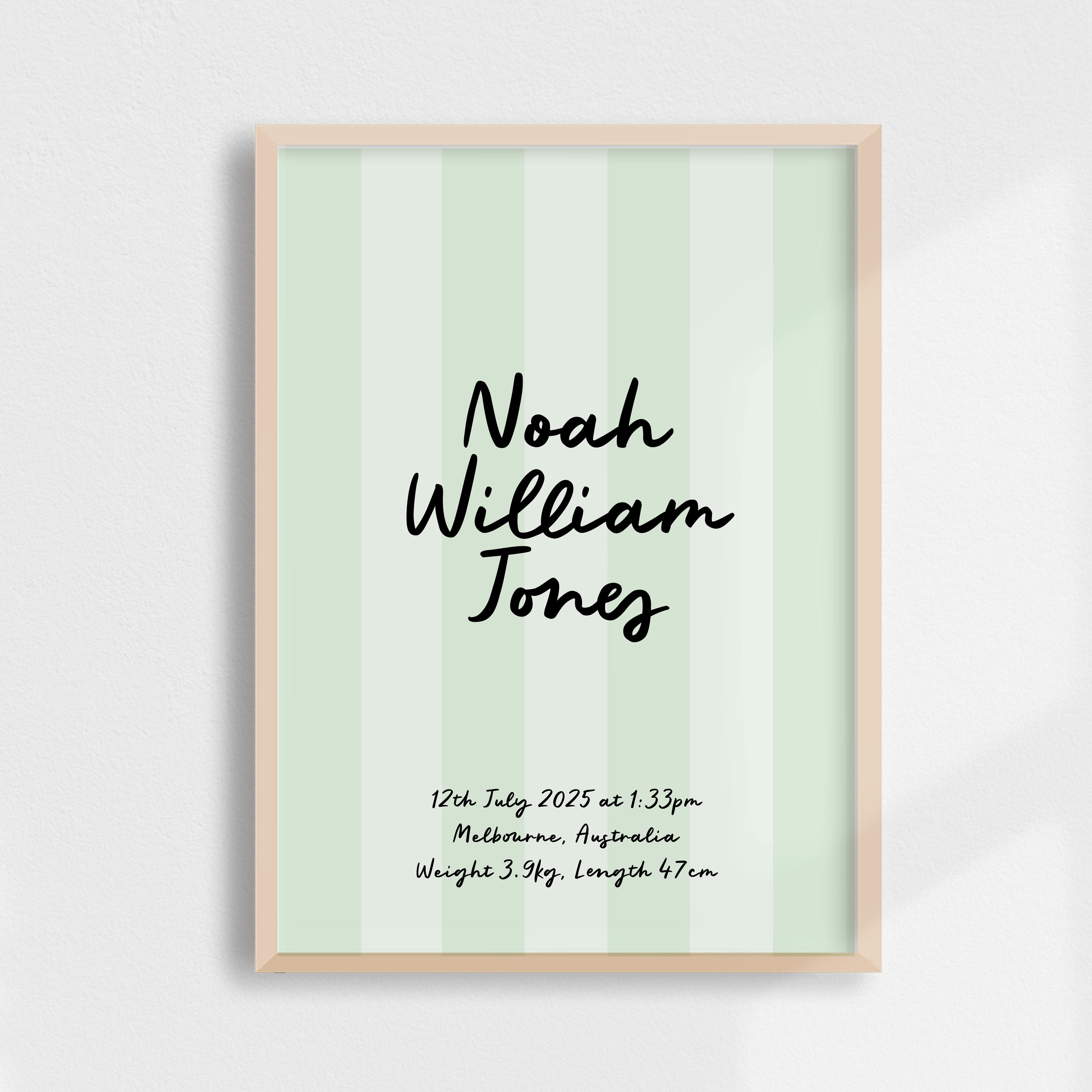 A personalised and boutique giclee birth print on quality paper individually typeset and tailored to the child's details. Timeless designs to grow with your little one. Made personally for you by our in-house design team in Melbourne. Originally created by Printspace cofounder and designer Mara Girling.