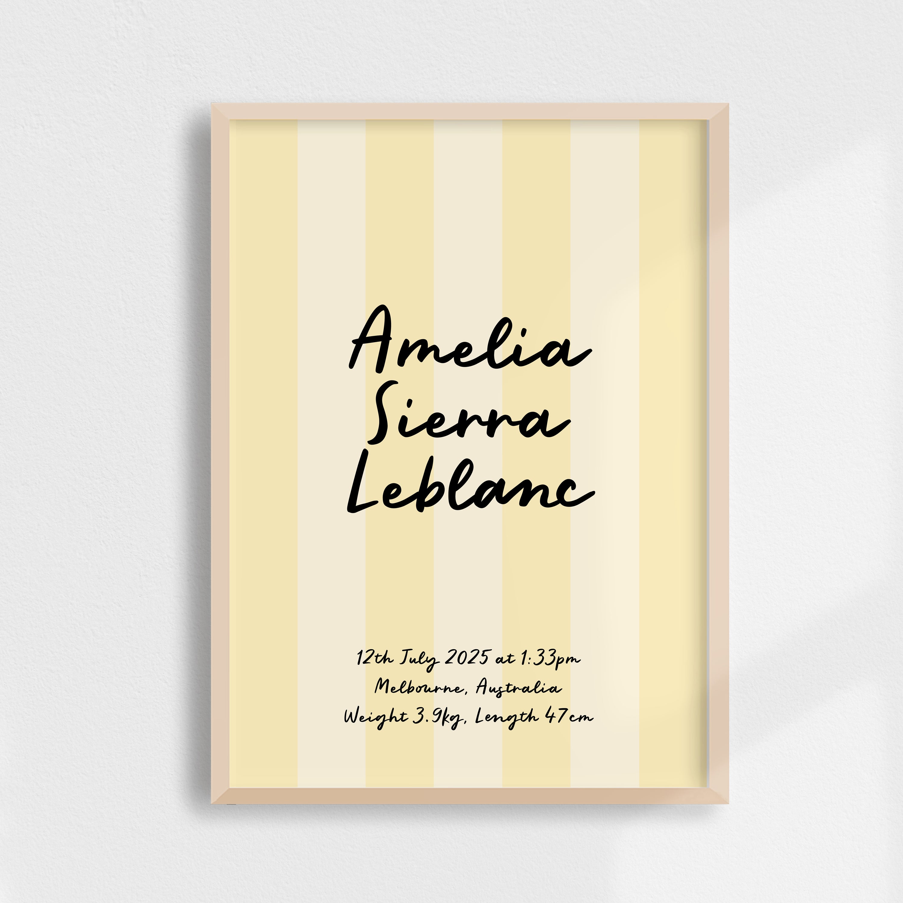 A personalised and boutique giclee birth print on quality paper individually typeset and tailored to the child's details. Timeless designs to grow with your little one. Made personally for you by our in-house design team in Melbourne. Originally created by Printspace cofounder and designer Mara Girling.